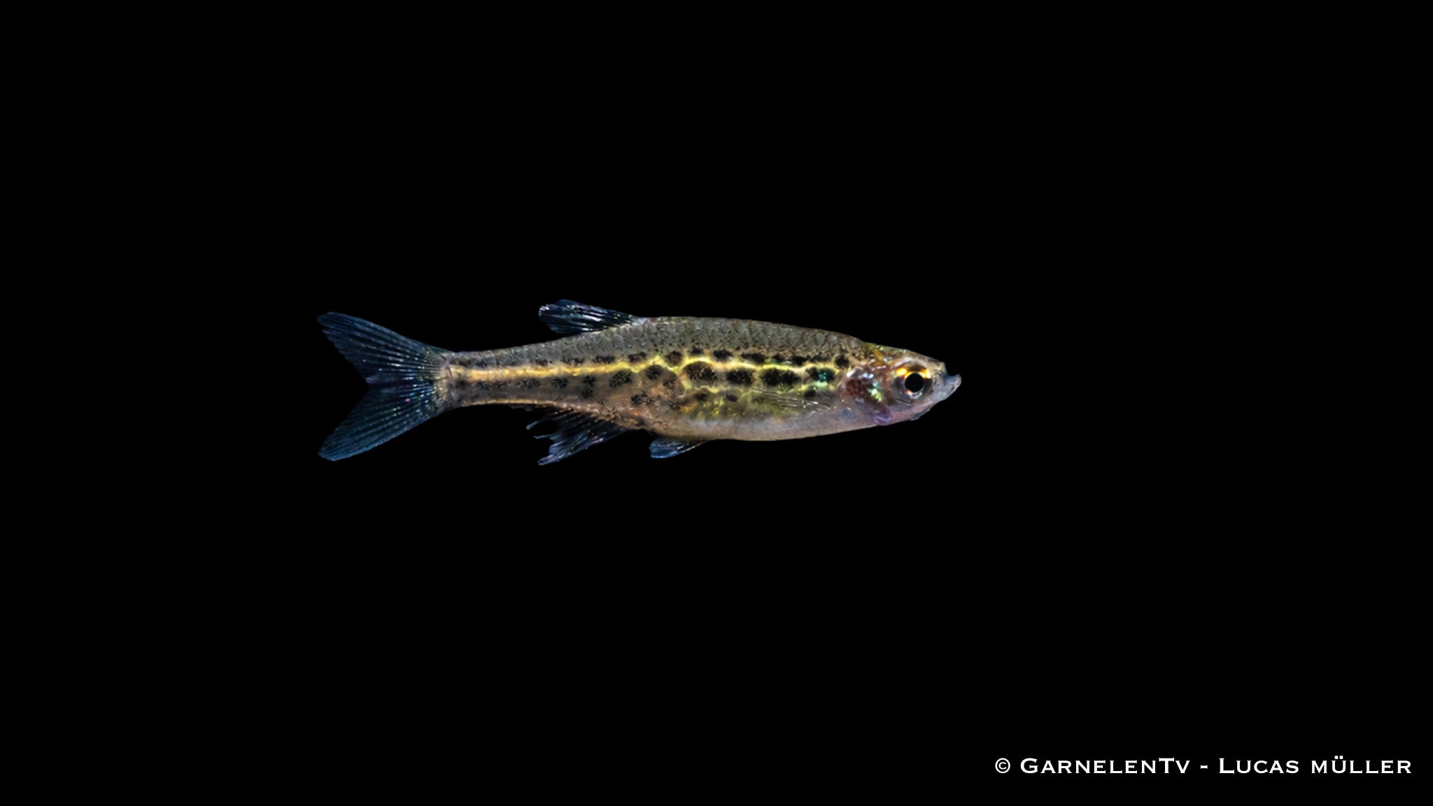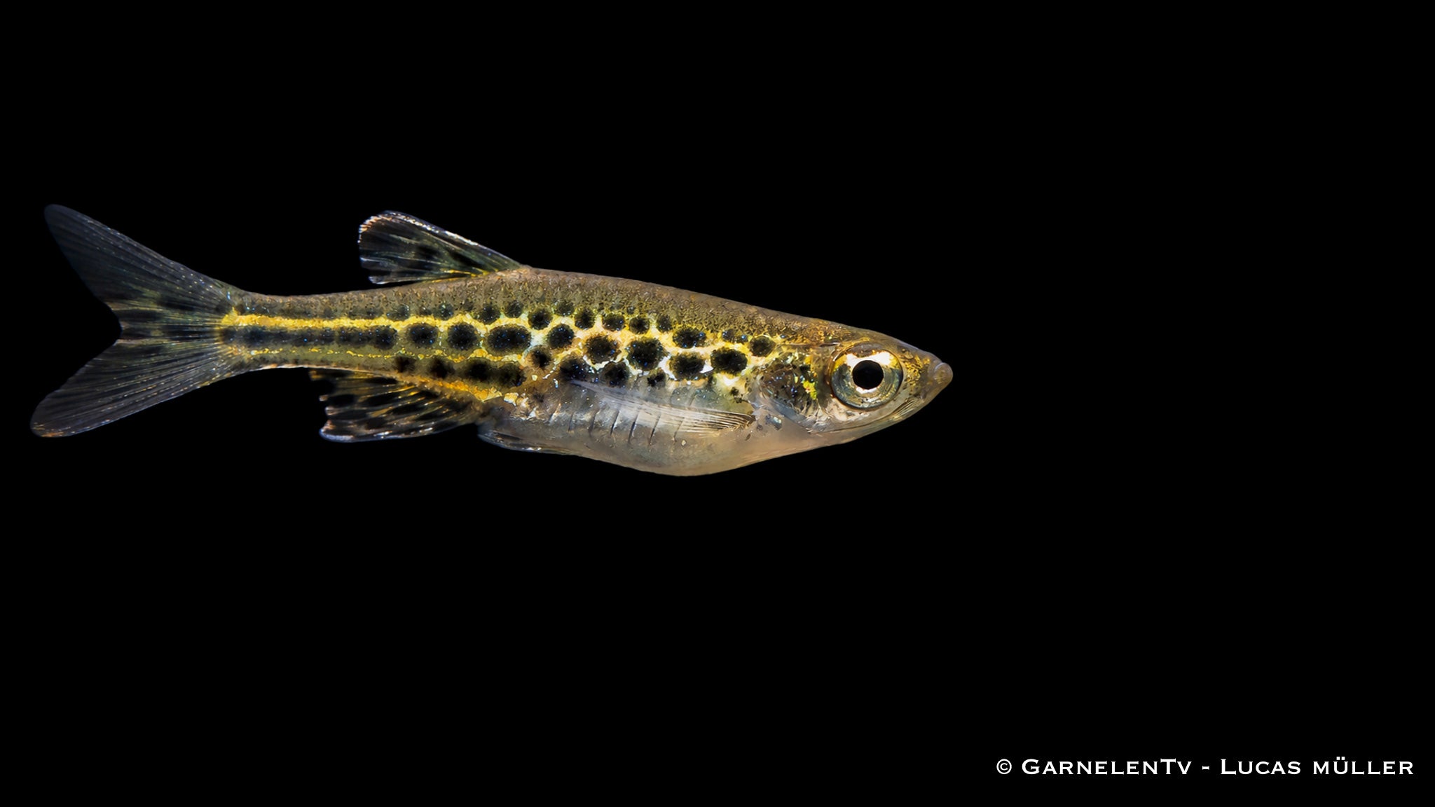 Charakteristisch für Danio tinwini ist seine auffällige Leopardzeichnung mit zahlreichen dunklen Punkten auf einem goldgelben bis silbrigen Körper. Diese kontrastreiche Musterung macht ihn zu einem echten Blickfang, besonders in gut beleuchteten Aquarien. Die intensive Zeichnung kommt in Gruppen besonders gut zur Geltung.